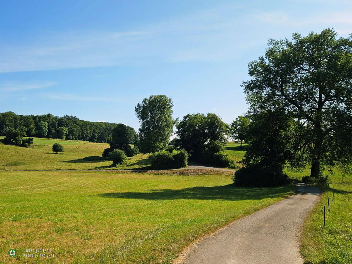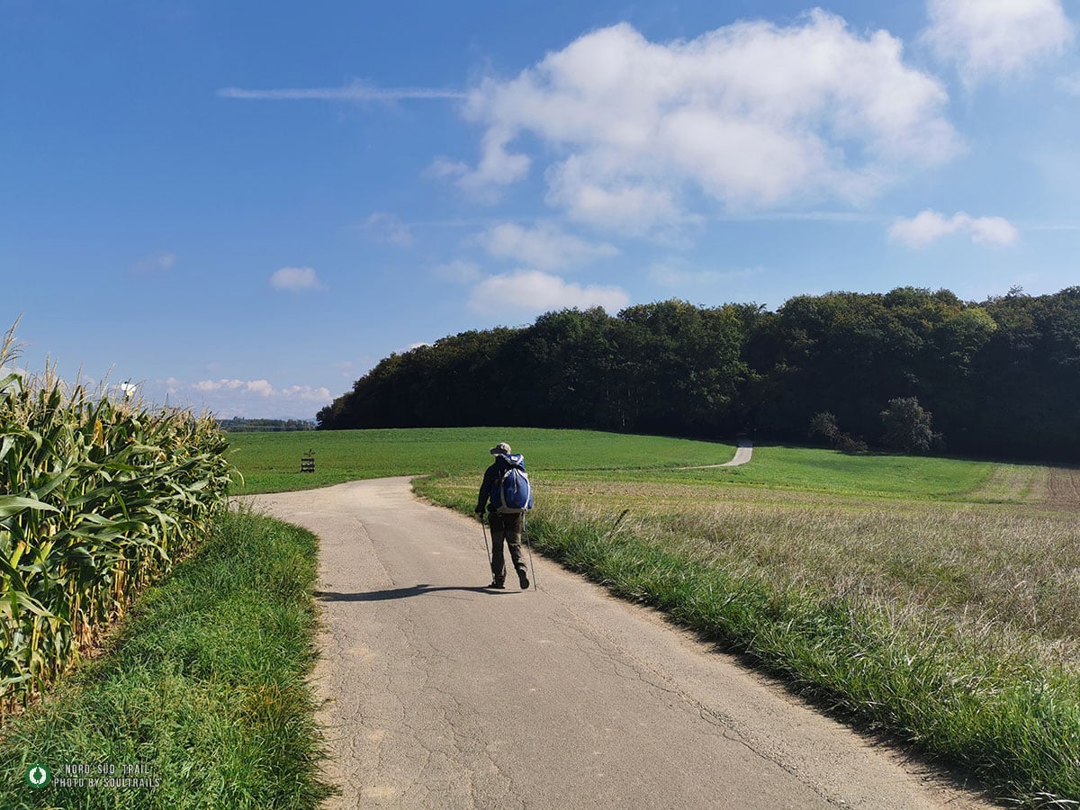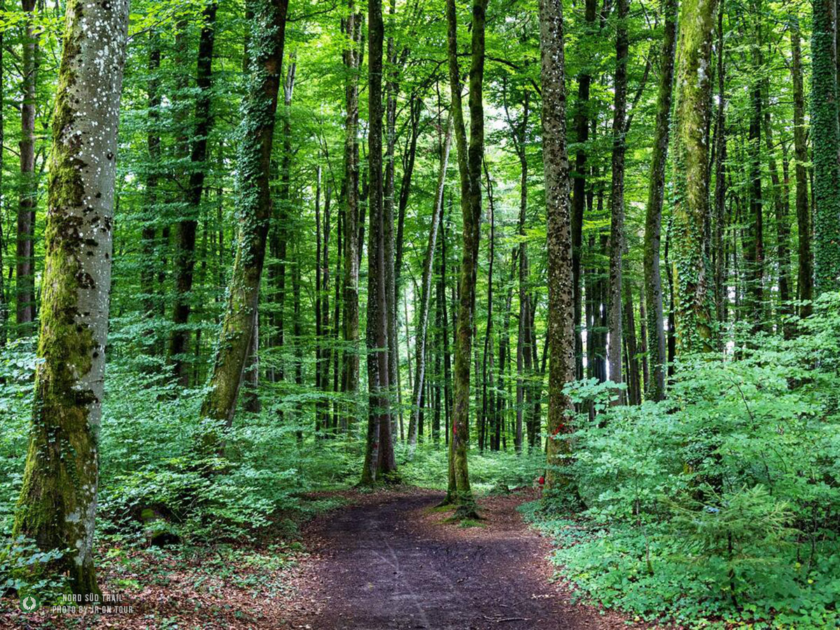 Das kleine Stück hinunter vom Westweg zum Trailhead des Main-Neckar-Rhein-Wegs folgt keinem offiziellen Wanderweg. Hier heißt es aufmerksam bleiben, den Blick regelmäßig aufs GPS werfen und dem vertrauten NST-Zeichen folgen. Bald ist Lörrach erreicht – oder genauer gesagt: der Hauptbahnhof, an dem der Main-Neckar-Rhein-Weg offiziell beginnt. In diesem Abschnitt wird er vom Schwarzwaldverein betreut. Südlich der Stadt liegt eine Jugendherberge, die sich als praktischer Übernachtungsstopp anbietet, bevor es am nächsten Morgen richtig losgeht. Die ersten Kilometer sind unspektakulär, aber angenehm. Dichte Forstbestände umgeben den Pfad, und die Stadt verschwindet langsam hinter den Bäumen. Das Licht fällt gefiltert durch die hohen Stämme, der Boden ist weich, und allmählich stellt sich wieder dieses leise, gleichmäßige Wandertempo ein. Vorbei am Siebenbannstein – einer uralten Grenz- und Wegmarke, die still im Wald liegt – geht es weiter Richtung Adelhausen.