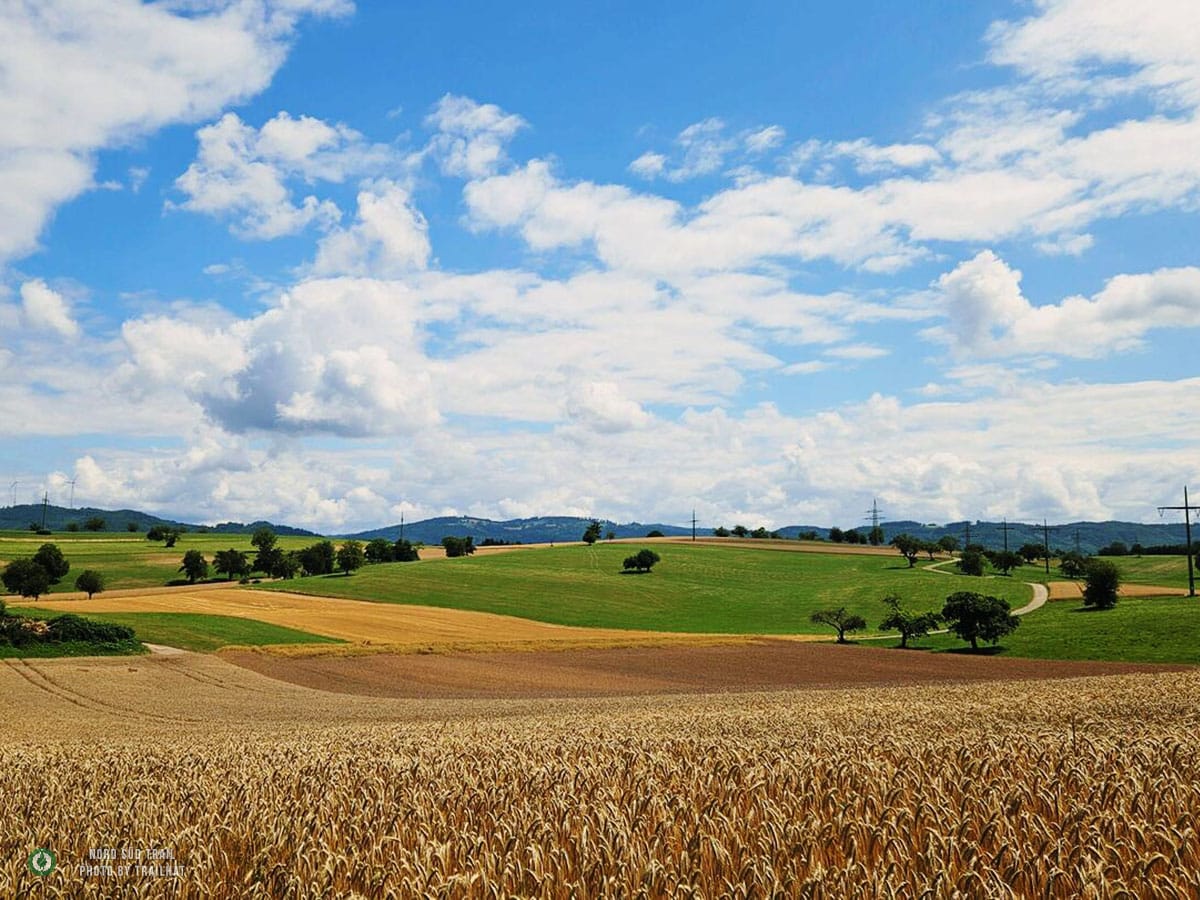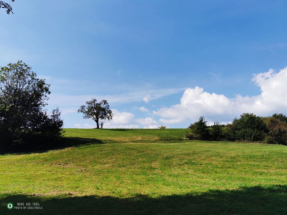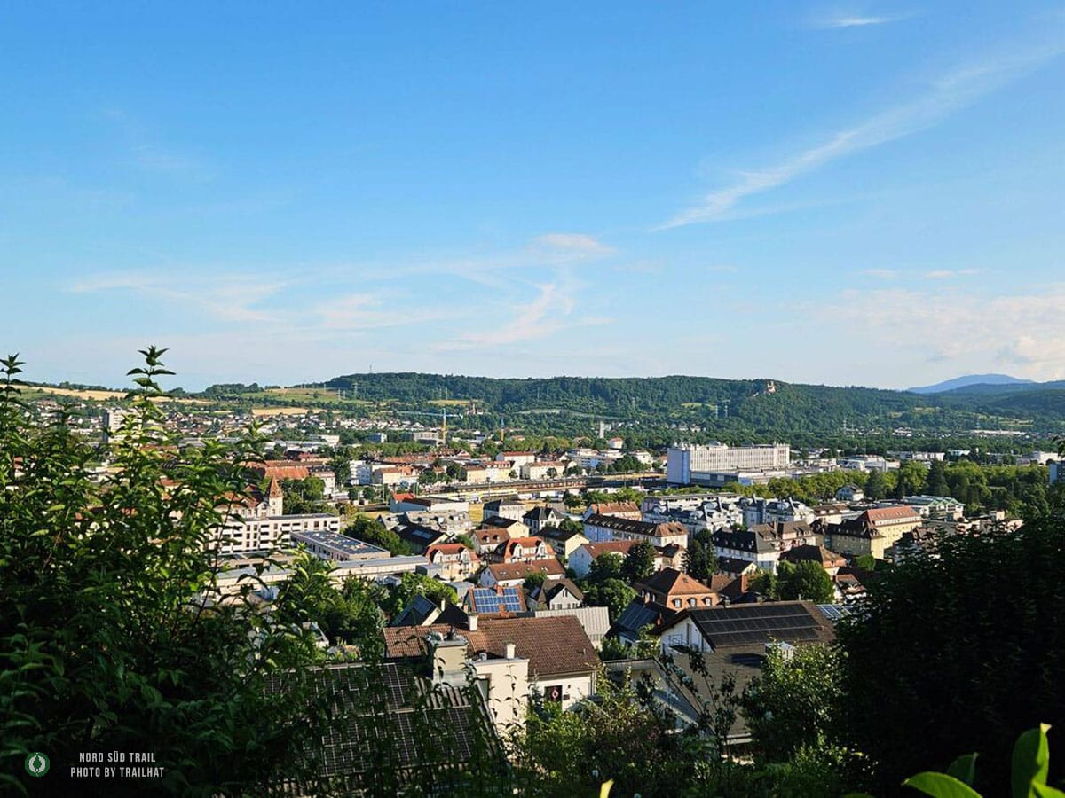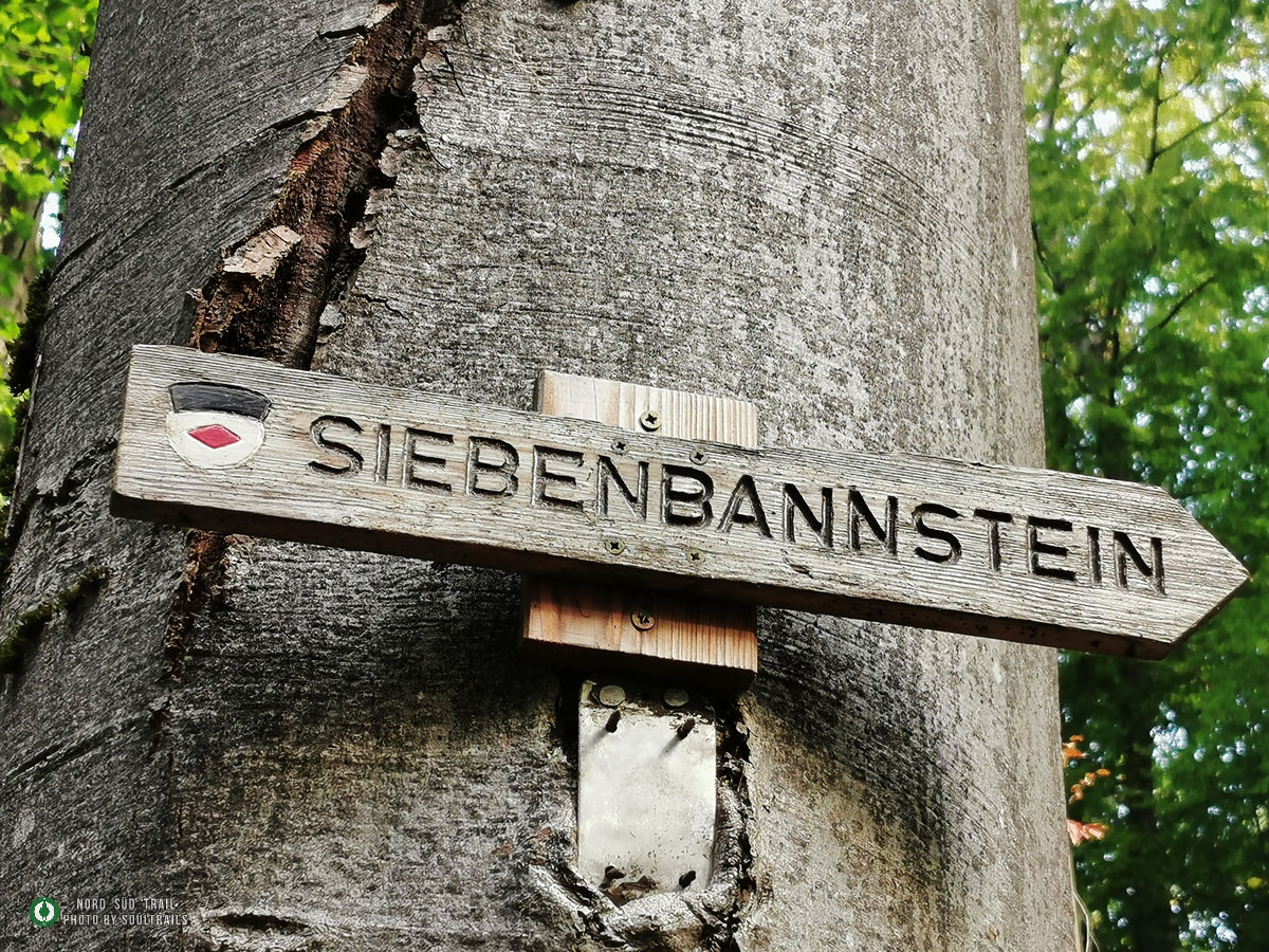 Das kleine Stück hinunter vom Westweg zum Trailhead des Main-Neckar-Rhein-Wegs folgt keinem offiziellen Wanderweg. Hier heißt es aufmerksam bleiben, den Blick regelmäßig aufs GPS werfen und dem vertrauten NST-Zeichen folgen. Bald ist Lörrach erreicht – oder genauer gesagt: der Hauptbahnhof, an dem der Main-Neckar-Rhein-Weg offiziell beginnt. In diesem Abschnitt wird er vom Schwarzwaldverein betreut. Südlich der Stadt liegt eine Jugendherberge, die sich als praktischer Übernachtungsstopp anbietet, bevor es am nächsten Morgen richtig losgeht. Die ersten Kilometer sind unspektakulär, aber angenehm. Dichte Forstbestände umgeben den Pfad, und die Stadt verschwindet langsam hinter den Bäumen. Das Licht fällt gefiltert durch die hohen Stämme, der Boden ist weich, und allmählich stellt sich wieder dieses leise, gleichmäßige Wandertempo ein. Vorbei am Siebenbannstein – einer uralten Grenz- und Wegmarke, die still im Wald liegt – geht es weiter Richtung Adelhausen.