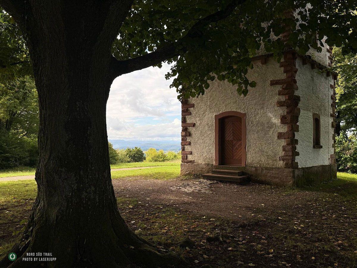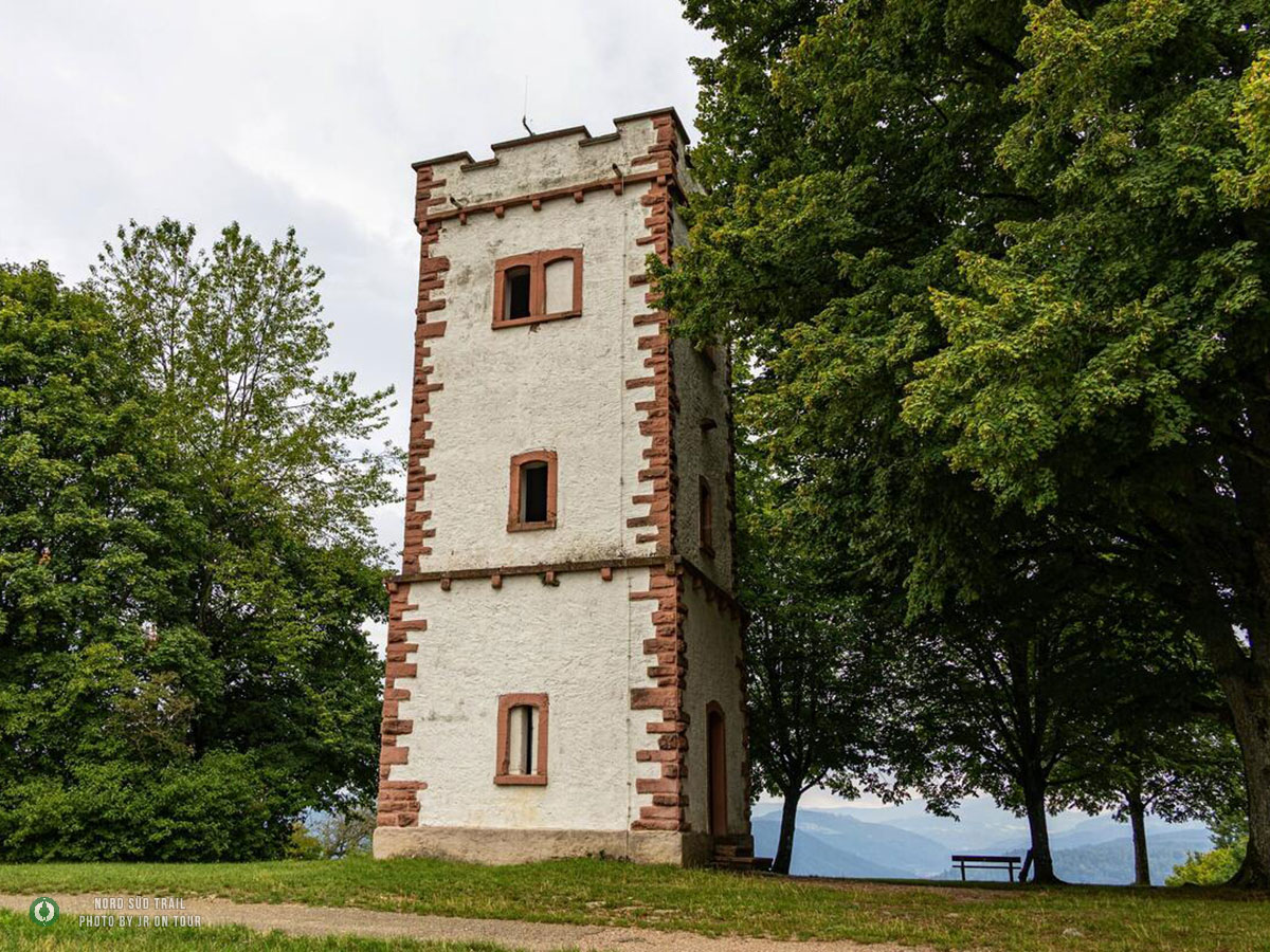 Hinter dem kleinen Ort taucht unvermittelt ein alter Bekannter auf: der Westweg. Wer hier kurz verwirrt auf die Karte schaut, sei beruhigt – es handelt sich um die sogenannte Ostvariante. Für ein paar Kilometer laufen beide Wege parallel, und welche Markierung man wählt, ist fast egal. Die rote Raute des Westwegs ist ohnehin präsenter und begleitet einen verlässlich durch den dichten Wald. Nach einer Weile öffnet sich das Gelände, und der Hohe Flum Turm kommt in Sicht. Sein massiver Steinbau steht wie ein stiller Wächter über den Wäldern, und wer die wenigen Stufen hinaufsteigt, wird mit einer weiten Aussicht über den Dinkelberg und die Rheinebene belohnt. Unten am Fuß des Turms laden Picknickbänke zu einer ausgedehnten Rast ein – ein guter Moment, um kurz innezuhalten und den Blick schweifen zu lassen.