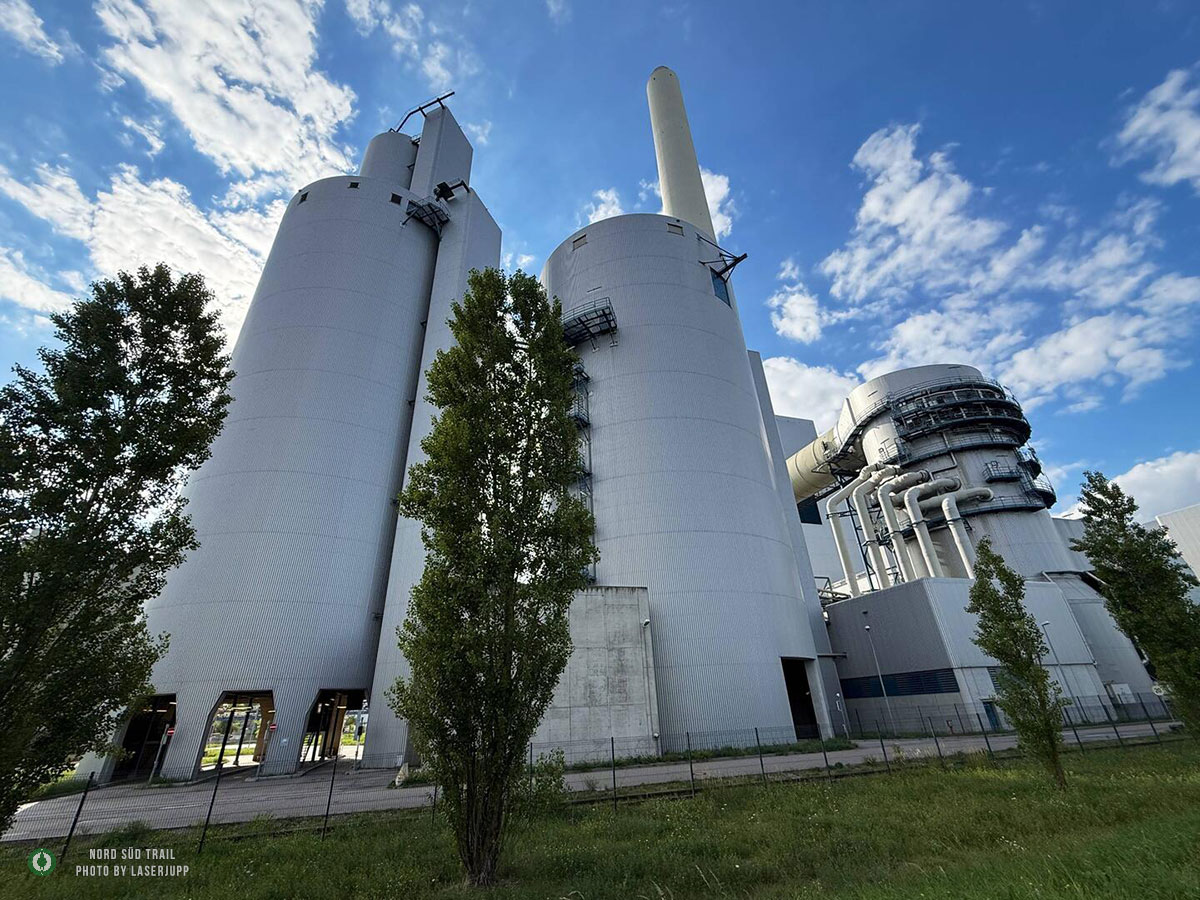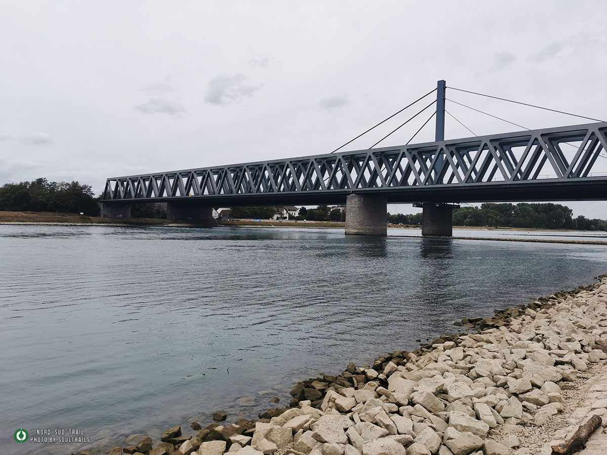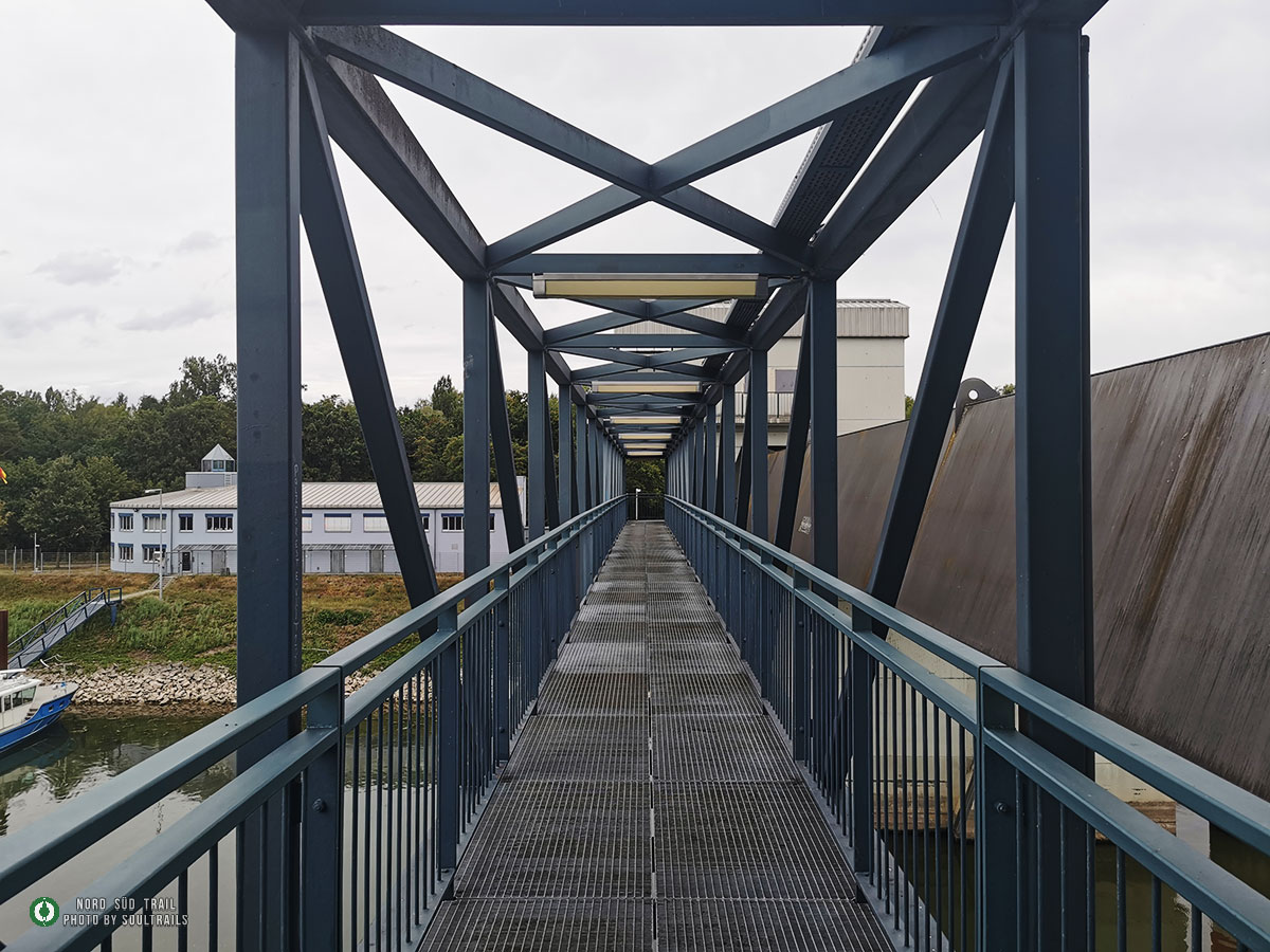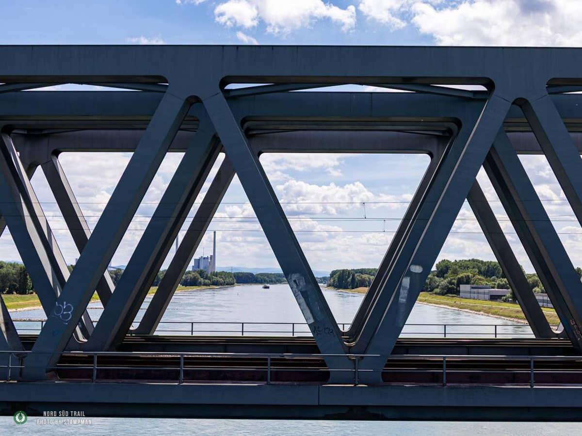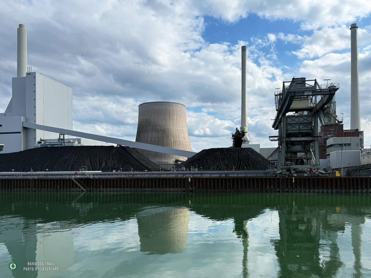 Von der Rheinbrücke geht es die ersten Kilometer flussabwärts Richtung Süden. Der Blick über das breite Wasserband, die Schiffe und die Auenlandschaft begleitet den Weg, bevor man das Hafengebiet erreicht. Hier erhebt sich das mächtige Rheinhafendampfkraftwerk, das einen eigenwilligen Kontrast zur Natur bildet. Tatsächlich führt der Weg mitten hindurch, eine der ungewöhnlichsten Passagen des gesamten Nord Süd Trails.